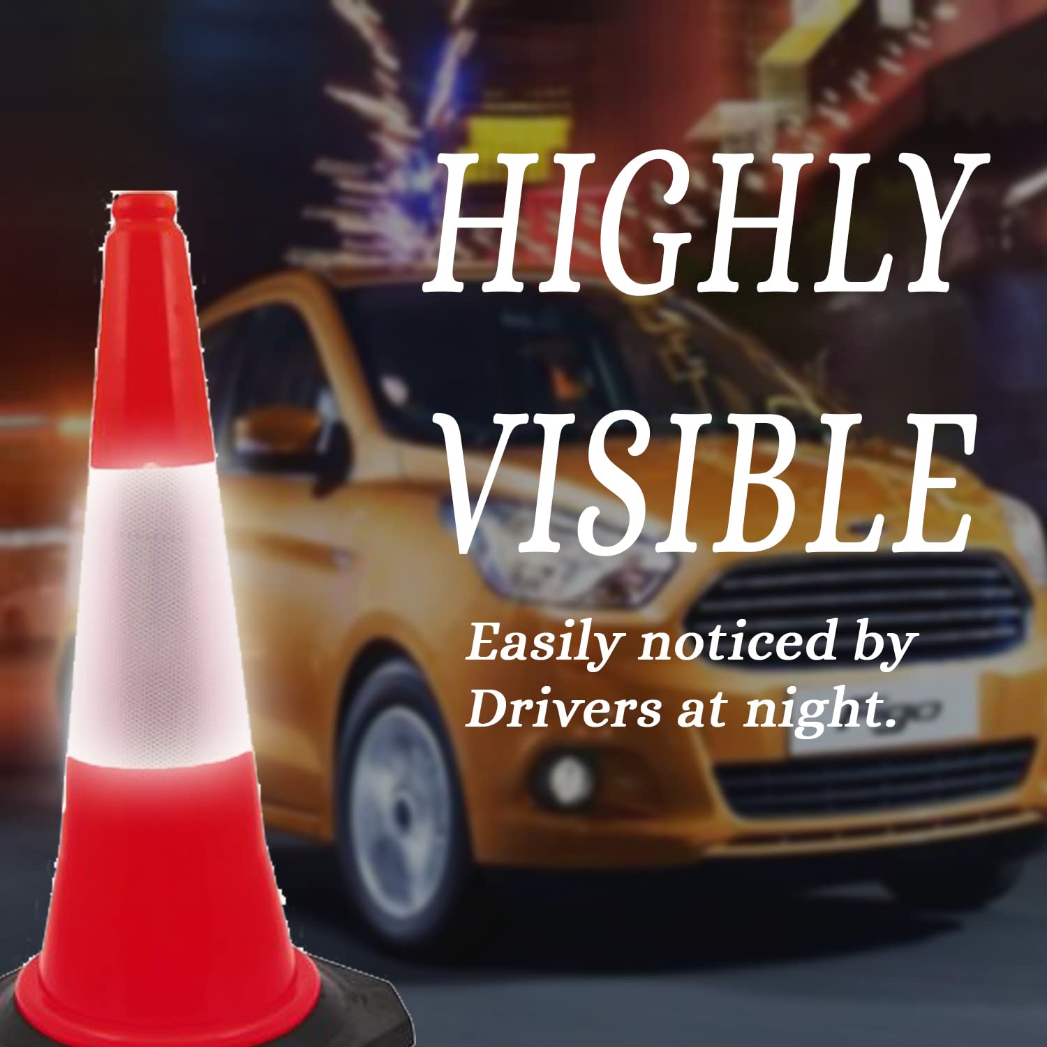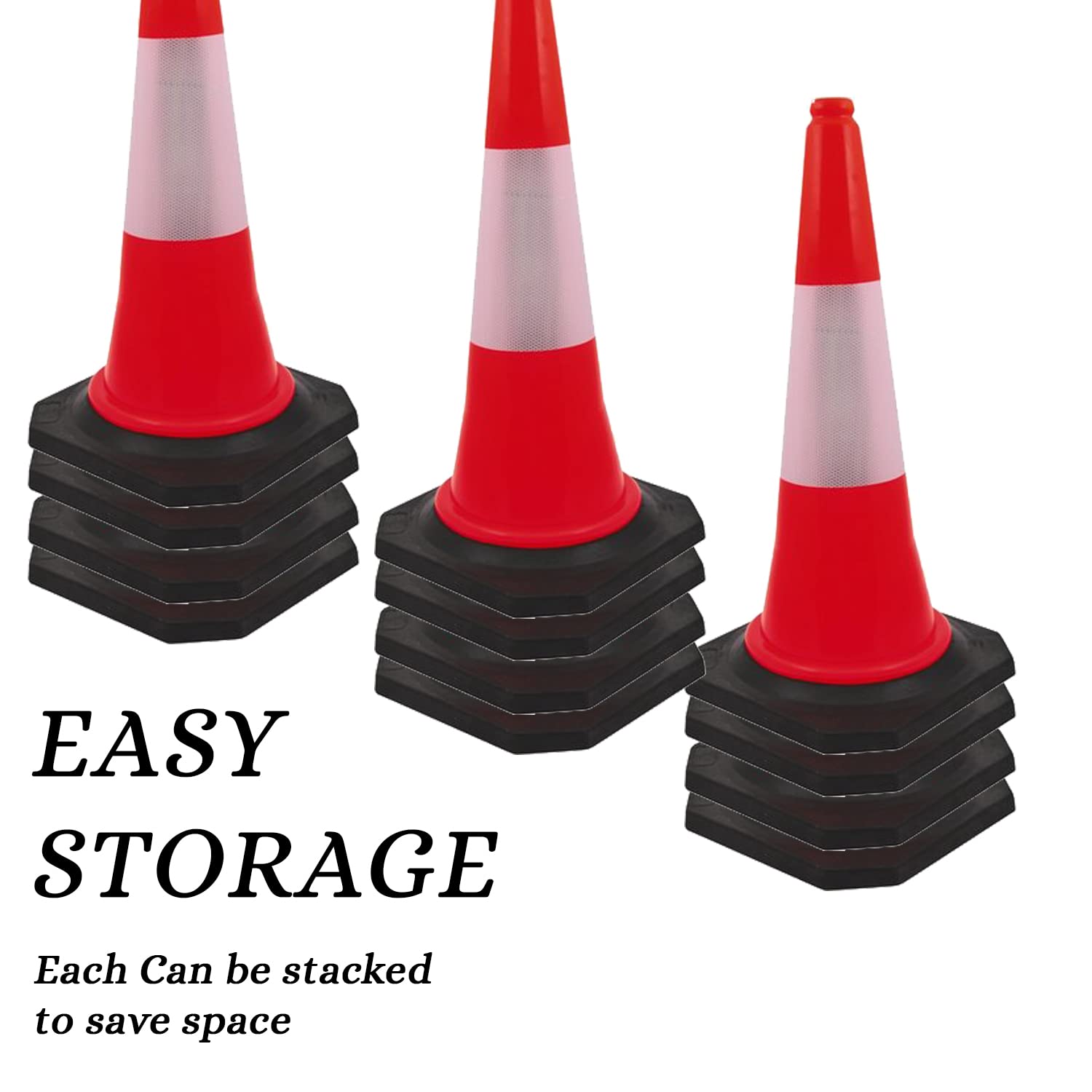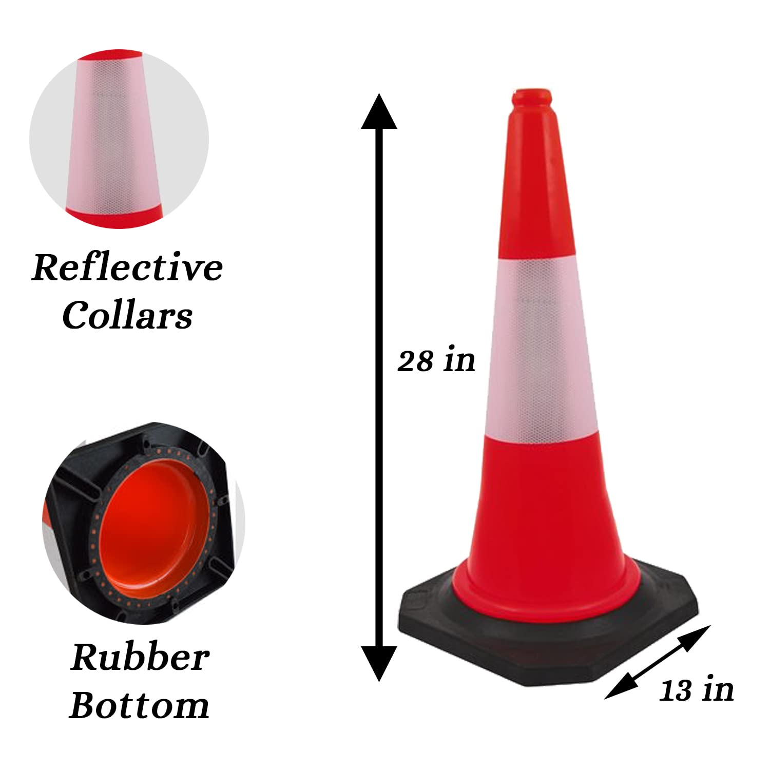 The weighted rubber base provides superior stability, preventing the cone from toppling over due to wind, vehicle turbulence, or accidental contact. Its bright orange color with reflective collar ensures maximum visibility during the day, night, and in low-light conditions, making it an essential tool for road safety, construction zones, parking management, and event control.